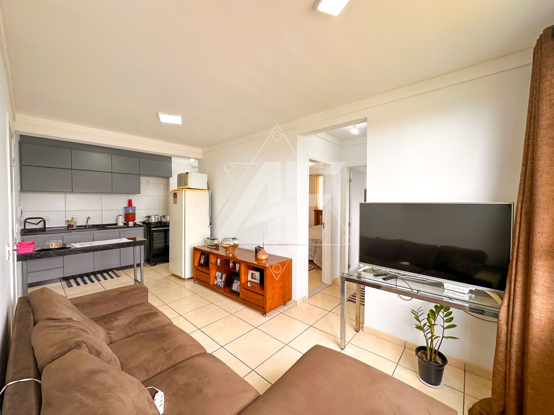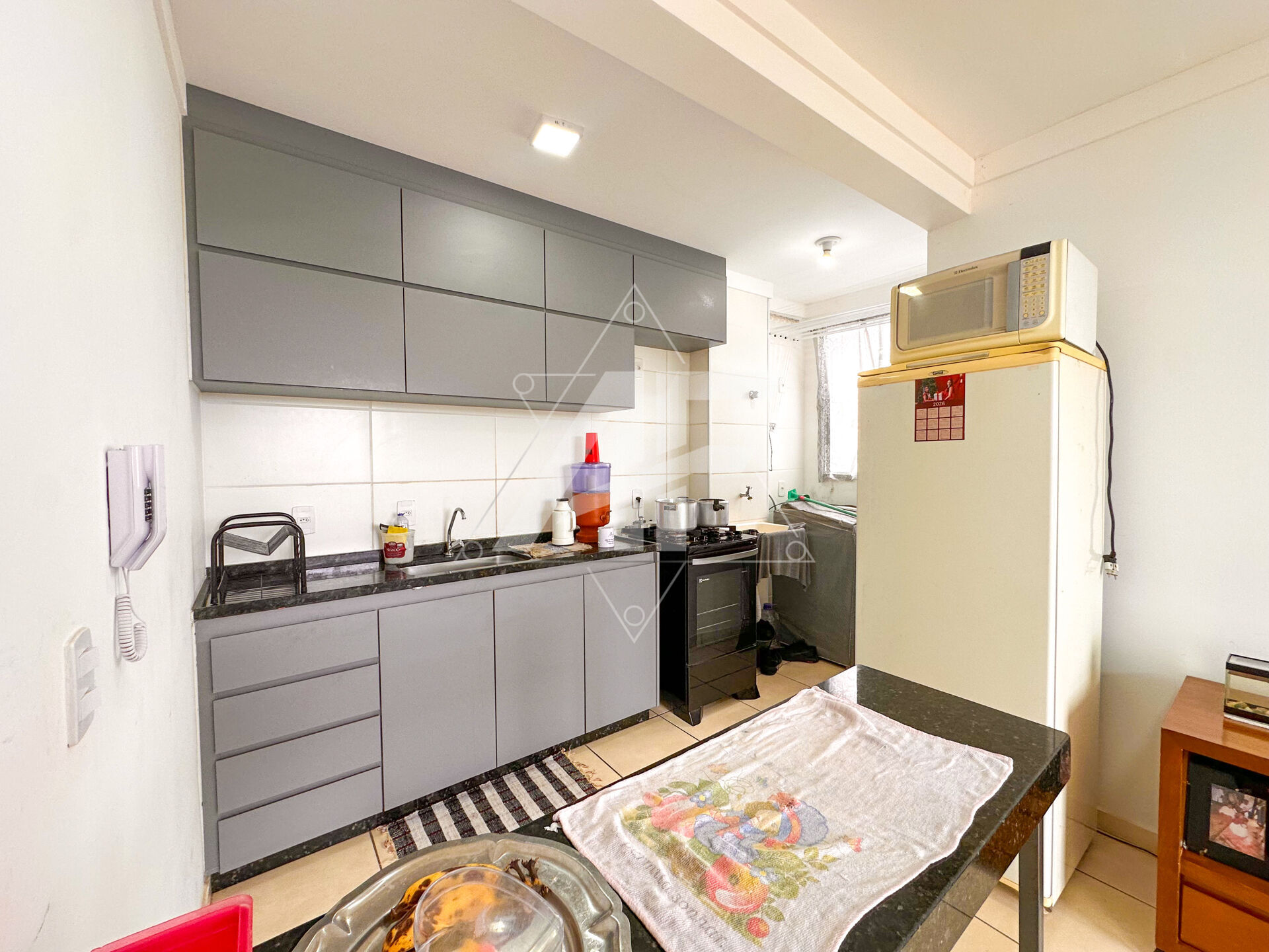 Apartamento com 2 dormitórios amplos, sala para 2 ambientes (jantar e TV), integrada a cozinha americana ja com armarios, área de serviço, 1 banheiro social, 1 vaga de garagem coberta .